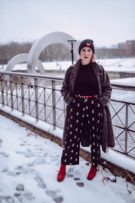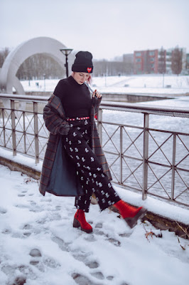 最小限の努力で強い印象を与える簡単コーディネートです。コートは他のものでも良かったかもしれませんが、その日は、暗くなる直前に急いで降り積もる雪の中、外に飛び出したので、私のオーバーコートは全く合わないのですが…そこは気にせず…。