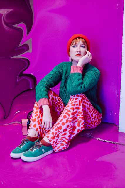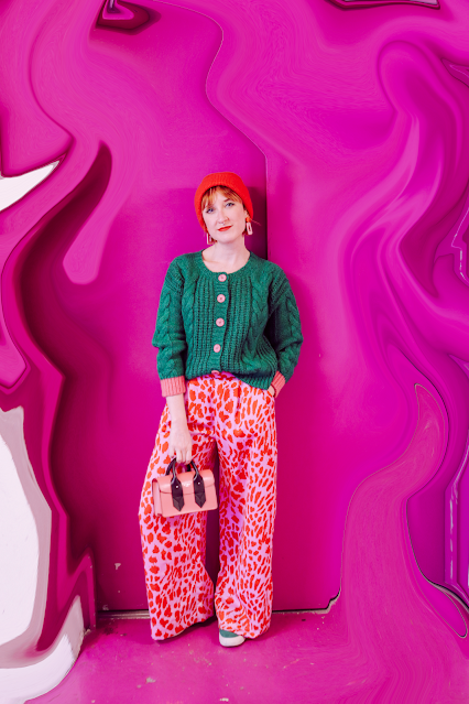 それから、インパクトのあるパンツとビーニーの組み合わせもこのカーディガンにピッタリ。どれも色鮮やかですが、思い切った色の組み合わせは、意外にも調和がとれてまとまったコーディネートに仕上げてくれます。