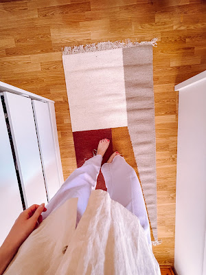 そして下の写真にあるように、デ バイエンコルフ(De Bijenkorf)では、ベッドリネンと素敵なカーペットの2つを選び、掛け布団カバーと枕カバーはヴァンダイク(Vandyck)のものにしました。色合いや柔らかさにとても満足しています。セール品で、品質の割には本当に安かったです。そして、ドレッシングルームの前に敷いたこの小さなスペースにぴったりと合う長いラグはファームリヴィング(Ferm Living)のものです。濃い色の配色が美しく、お値段は135ユーロとリーズナブルでした。