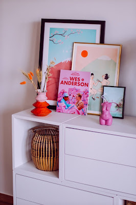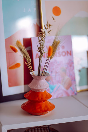飾り付けには、素敵なFluidのキャンドルを。そしておしゃれな雑誌やデ バイエンコルフ(De Bijenkorf)で一目惚れした花瓶。この花瓶はOrigami &Kleveringのもので、ピンクとオレンジの組み合わせが素敵です。